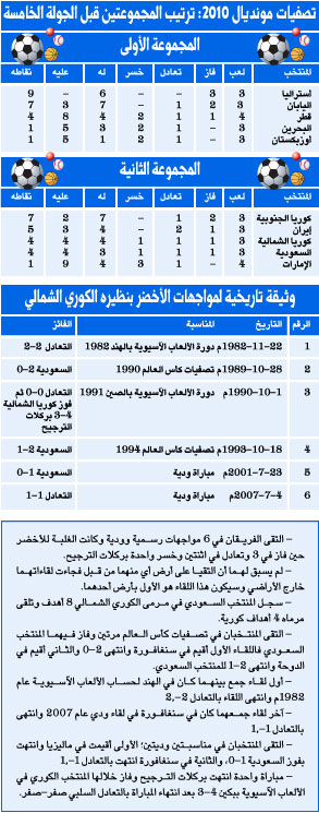 تنطلق صباح اليوم بتوقيت المملكة العربية السعودية أولى مباريات الجولة الرابعة من التصفيات النهائية الآسيوية المؤهلة إلى نهائيات كأس العالم لعام 2010 بجنوب أفريقيا، وسيخوض منتخبنا الوطني السعودي مباراة غاية في الأهمية أمام المنتخب الكوري الشمالي وسط أجواء باردة جداً كما هو متوقع لحساب المجموعة الثانية، فيما سيخوض الممثل الآخر في المجموعة الأولى منتخب البحرين لقاءً مهماً أمام أوزبكسان في طشقند فيما سيستضيف منتخب إيران نظيره كوريا الجنوبية في طهران ويلتقي اليابان مع استراليا في سايتاما اليابانية.. مباريات اليوم ستكون لحساب الجولة الخامسة والمهمة بدرجة كبيرة في أهم مرحلة في التصفيات: