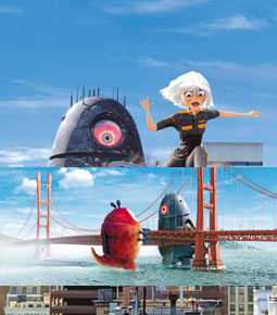 مشهدان من الفيلم الكرتوني ثلاثي الابعاد (الوحوش في مواجهة الغرباء) من إنتاج شركة (دريم وركس) SKG الذي تعهد رئيسها التنفيذي بإنتاج كل أفلامه بتقنية ثلاثية الأبعاد