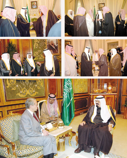 استقبل خادم الحرمين الشريفين الملك عبدالله بن عبدالعزيز آل سعود- حفظه الله- في الديوان الملكي بقصر اليمامة أمس سماحة مفتي عام المملكة ورئيس هيئة كبار العلماء وإدارة البحوث العلمية والإفتاء الشيخ عبدالعزيز بن عبدالله آل الشيخ وفضيلة رئيس المجلس الأعلى للقضاء الشيخ الدكتور صالح بن عبدالله بن حميد وأصحاب الفضيلة أعضاء هيئة كبار العلماء وأعضاء المجلس الأعلى للقضاء وفضيلة رئيس المحكمة العليا وأعضاء المحكمة وفضيلة رئيس المحكمة الإدارية العليا وأعضاء مجلس القضاء الإداري في ديوان المظالم ورؤساء محاكم الاستئناف الذين شملتهم الأوامر الملكية الكريمة بتعيينهم في مناصبهم الجديدة.