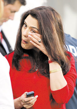 ممثلة بوليوود الهندية برايتي زينتا تمسح دموعها قبل إجرائها لقاء مع إحدى وسائل الإعلام نتيجة هجوم في لاهور بشرق باكستان تم التخطيط له ضد فريق الكريكت السريلانكي. |