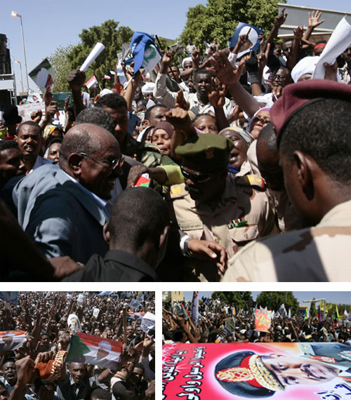 وتساءل البشير لماذا يتحرك المجتمع الدولي ضده بينما ترك (إسرائيل ضربت غزة أمام مرأى الجميع). إلى ذلك انضم الرئيس السوداني إلى تظاهرة مؤيدة له الخميس في الخرطوم. وهتف البشير متوجها إلى عشرات آلاف المتظاهرين المتجمعين في ساحة الشهداء بوسط الخرطوم (الله اكبر، لا اله الا الله)، متهماً القادة الأميركيين والأوروبيين بأنهم (المجرمون) الحقيقيون. وندد المتظاهرون بالولايات المتحدة وبريطانيا و(اليهود) وبالمدعي العام في المحكمة الجنائية الدولية لويس مورينو - اوكامبو. وردد البشير مراراً في الأشهر الأخيرة أن المحكمة الجنائية الدولية هي نتيجة (مؤامرة صهيونية مئة بالمئة) تهدف إلى زعزعة استقرار السودان. وأعلن البشير طرد عشر وكالات إغاثة أجنبية من البلاد وذلك لخرقها القانون. وقال إن حكومته ستتعامل مع أي تحرك للإضرار باستقرار السودان. وقال البشير خلال جلسة حضرها كبار الساسة وأعضاء مجلس من ناحية أخرى أعلنت منظمة (أطباء بلا حدود) الخميس أنها تلقت أمراً من الحكومة السودانية بوقف كل أنشطتها في دارفور (غرب السودان) حيث يقوم فرعاها الهولندي والفرنسي فقط بتقديم العناية لـ400 ألف شخص. إلى ذلك حث الأمين العام للأمم المتحدة بان كي مون الخرطوم على حماية المدنيين والعودة عن قرار طرد منظمات غير حكومية. ولكن بان لم يطلب علناً من البشير التعاون مع المحكمة الجنائية الدولية. وقالت الناطقة ميشال مونتاس في بيان إن بان يعترف بسلطة المحكمة الجنائية الدولية (كمؤسسة قضائية مستقلة).