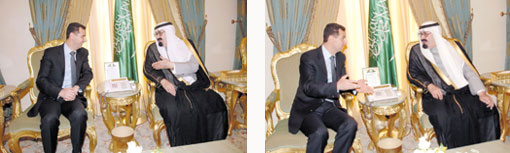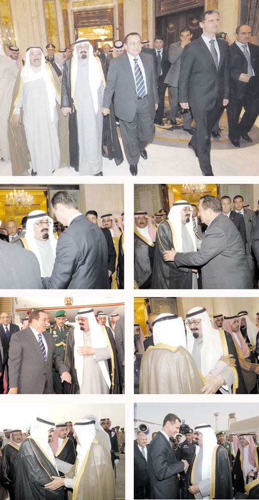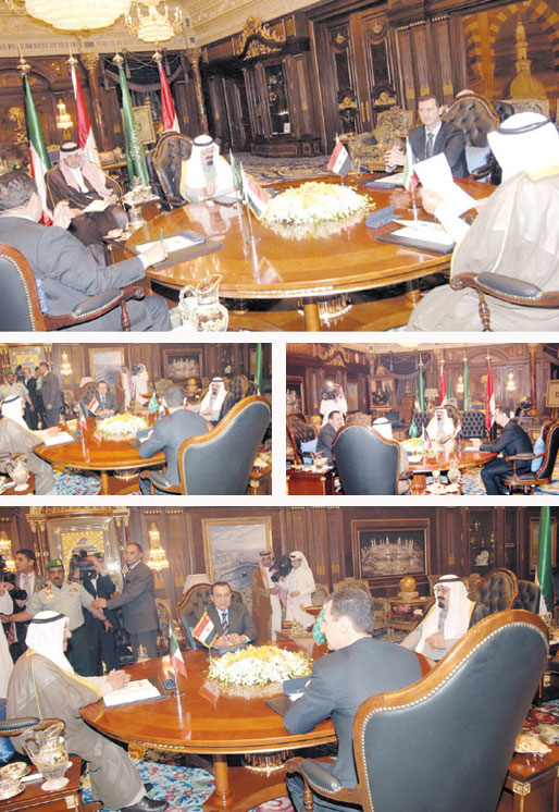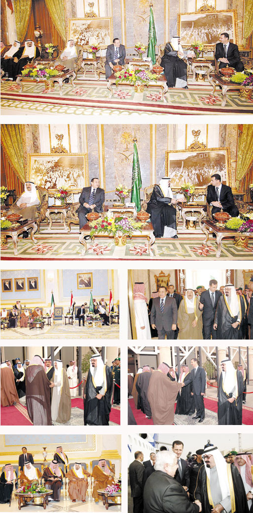 عقد خادم الحرمين الشريفين الملك عبدالله بن عبدالعزيز آل سعود وإخوانه فخامة الرئيس محمد حسني مبارك رئيس جمهورية مصر العربية وفخامة الرئيس الدكتور بشار الأسد رئيس الجمهورية العربية السورية وصاحب السمو الشيخ صباح الأحمد الجابر الصباح أمير دولة الكويت اجتماع قمة مساء أمس في قصر