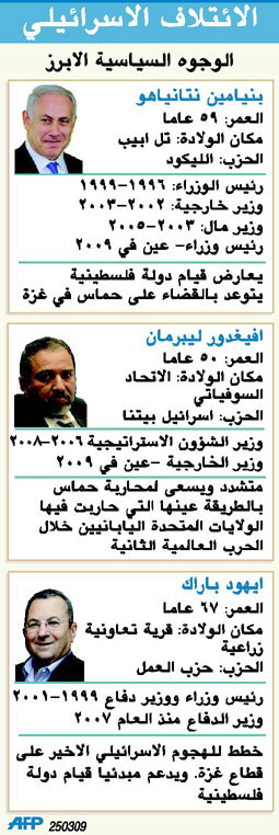 ذكرت مصادر حزبية في إسرائيل أنّ رئيس الوزراء الإسرائيلي القادم (بنيامين نتنياهو) سيعلن يوم الاثنين القادم عن تشكيل حكومته التي ستضم 69 عضو كنيست 27 من (ليكود)، 15 من (إسرائيل بيتنا)، 13 من (العمل)، 11 من (شاس)، و3 من (هبيت هيهودي) .. وما زال حزب (يهدوت هتوراه) الذي