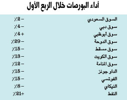 وعلى الصعيد الإقليمي تباينت أداء مؤشرات الأسواق الخليجية بشكل ملحوظ، وكانت الخسارة الأكبر من نصيب سوق الدوحة الذي فقد 29% من قيمته خلال الربع الأول، فيما خسر سوق مسقط 15% من قيمته، ولم يكن أداء السوق الكويتي بأحسن حال فخسر 13% من قيمته خلال الربع الأول وهو رقم قريب لما فقد مؤشر السوق البحريني، فيما جاءت التراجعات أقل حدة في سوق دبي الذي خسر 4% فقط، وكان الأداء الإيجابي محصوراً في سوق أبو ظبي الذي توشح بمفرده اللون الأخضر محققاً مكاسب بلغت 4% خلال الربع الأول لهذا العام.