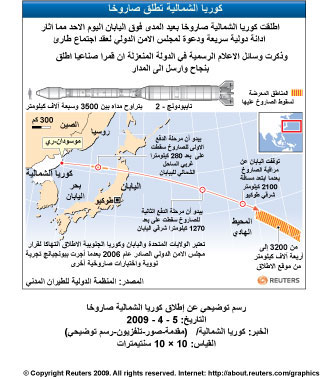 أطلقت كوريا الشمالية صاروخاً بعيد المدى فوق اليابان أمس الأحد مما أثار ادانة دولية سريعة ودعوة لمجلس الامن الدولي لعقد اجتماع طارئ. وذكرت وسائل الاعلام الرسمية في الدولة المنعزلة ان قمرا صناعيا اطلق بنجاح وارسل إلى المدار. وقال الرئيس الامريكي باراك اوباما ان كوريا الشمالية