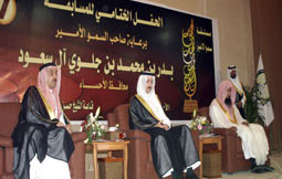 رعى صاحب السمو الأمير بدر بن محمد بن جلوي آل سعود محافظ الأحساء حفل تكريم المشاركين في مسابقة الأمير محمد بن فهد بن جلوي للقرآن الكريم والسنة والخطابة في قاعة الشيخ حسن آل الشيخ بجامعة الملك فيصل في محافظة الأحساء مساء أمس الأول وذلك بحضور صاحب السمو الأمير عبد العزيز بن محمد بن جلوي آل سعود المشرف العام على المسابقة وأصحاب السمو الأمراء عبد العزيز بن سعد بن جلوي وعبد الله فيصل بن جلوي وفهد بن عبد الله بن جلوي والشيخ صلاح بن محمد البدير إمام وخطيب الحرم النبوي الشريف والمشايخ والعلماء ورؤساء الدوائر الحكومية وجمع غفير من أولياء أمور المتسابقين، وفي ختام الحفل تم تكريم الجهات الداعمة واللجان العاملة في المسابقة من قبل محافظ الأحساء وفي نهاية التكريم تفضّل المشرف العام على المسابقة بإهداء درع لمحافظ الأحساء.