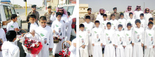 اصطفّ طلاب مدرسة عبدالرحمن بن عوف الابتدائية بمحافظة حفر الباطن صباح أمس الأول الأحد عند إشارات المرور تزين صدورهم صورة كتب عليها عبارة (حمداً لله على السلامة) حاملين بأيديهم وروداً وزهوراً تم توزيعها على المارة بمناسبة شفاء والدهم ولي العهد صاحب السمو الملكي الأمير سلطان بن عبدالعزيز، ثم توجهوا لمبنى محافظة حفر الباطن والتقوا بوكيل المحافظ والذي أثنى على البادرة الطيبة التي أقدم عليها الطلاب بمتابعة وتشجيع مدير التربية والتعليم عوض بن صالح السرور ومدير مدرسة عبدالرحمن بن عوف ومعلميها ثم توجه الطلاب لإدارة التربية والتعليم وتجولوا في أقسامها مهدين من قابلهم الورد وبطاقة التهنئة ثم اختتموا زياراتهم بزيارة مديرية الشرطة وتعليم البنات بالمحافظة.
