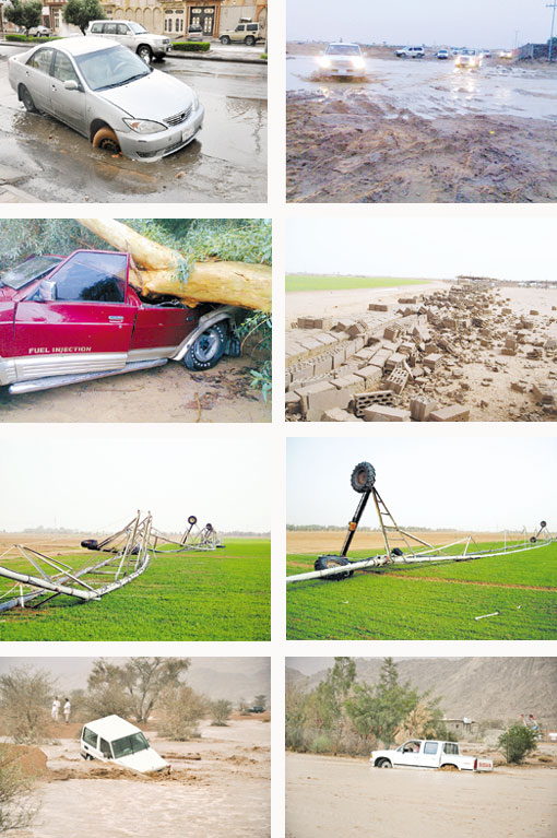 على الصعيد نفسه شهدت محافظة بقعاء ومدينة تربة حائل والقرى المحيطة بها هطول أمطار غزيرة مصحوبة بزخات من البرد في بعض المواقع ، وصاحب هذه الأمطار عواصف قوية تسببت في تلف بعض المحاصيل الزراعية وسقوط جدران المنازل واقتلاع الأشجار والنخيل في بعض المواقع. وقد استنفرت فرق الدفاع المدني جهودها ووجدت في مواقع السيول مع بلدية بقعاء والجهات الأمنية الأخرى، وتم إخلاء بعض المواطنين الذين حجزتهم السيول، حيث سقطت أحد أشجار (الكينا) الكبيرة على سيارة مواطن من نوع سفاري أمام منزله تسببت في تلفها كلياً. كما تسببت العواصف بانقلاب رشاش مزرعة ( 5 أبراج ) وتحطم نهائياً من قوة العاصفة. وبالقرب من أحد المنازل نجا عددٌ من الأطفال الذين كانوا يلعبون بجانب سور المنزل حيث هربوا من المطر وتفاجؤوا بسقوط السور الذي يبلغ طوله 50 متراً وتحطمه نهائياً..