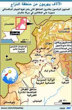 وعلى صعيد الوضع الداخلي الباكستاني قتل الجيش الباكستاني 55 مسلحاً من حركة طالبان في حين لقي ثلاثة جنود حتفهم في اشتباكات جديدة وقعت بمنطقة سوات شمال غربي البلاد حسبما أكد الجيش أمس الجمعة. وجاء القتال بينما تدفقت دفعات جديدة من اللاجئين خارج منطقة الصراع بعدما علقت السلطات مؤقتاً حظر التجوال قبيل عملية اجتياح برية وشيكة ضد طالبان. وواصلت القوات الباكستانية هجومها رغم تخفيف حظر التجوال، حيث دمرت المقاتلات والمروحيات الحربية مخابئ للمسلحين في أجزاء مختلفة من وادي سوات. وقالت وكالة الأمم المتحدة للاجئين إنها سجلت ما يربو على 834 ألف مدني منذ الثاني من مايو الجاري علاوة على 555 ألف مدني آخرين كانوا فروا من المنطقة بسبب القتال المتصاعد منذ أغسطس الماضي.