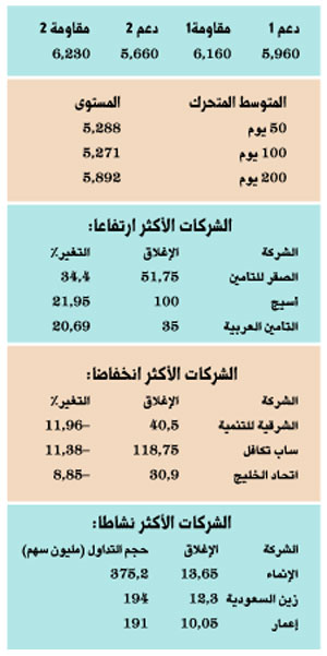 اختتم سوق الأسهم تداولات الأسبوع الماضي عند مستوى 6.044 نقطة مرتفعا بـ242 نقطة عن مستوى الافتتاح الأسبوعي والذي كان عند مستوى 5.802 نقطة ليحصد بهذا السوق مكاسب خلال الأسبوع المنصرم بنسبة 4.18% بلغت قيمة التداول الأسبوعية للسوق كاملا 48.7 مليار ريال، وبلغ حجم الأسهم المتداولة خلال الأسبوع 2.2 مليار سهم. نفذت من خلال عدد صفقات مبرمة في السوق بلغ عددها 1.126 مليون صفقة. تذبذب السوق خلال الأسبوع الماضي في مدى بلغ 276 نقطة حيث كان مستوى الافتتاح هو المستوى الأدنى لتعاملات الأسبوع. وكان المستوى الأعلى لهذا الأسبوع هو أعلى مستوى تمكن المؤشر من تسجيله خلال العام 2009م وأيضا هو المستوى الأعلى منذ شهر أكتوبر من العام الماضي 2008م. وعن أداء الشركات المدرجة فقد تمكنت 97 شركة من تحقيق مكاسب خلال تعاملات الأسبوع الماضي وجاءت شركة الصقر للتأمين على رأس قائمة الشركات الأكثر ارتفاعا بعد تسجيلها مكاسب بنسبة 34.4% بعد إغلاقها عند مستوى 51.75 ريال. تلاه سهم أسيج الذي أغلق عند حاجز 100 ريال مرتفعا بنسبة 21.95% وجاءت ثالثا شركة التأمين العربية التي كسبت ما نسبته 20.69% بعد إغلاقها عند مستوى 35 ريالا. وبلغ عدد الشركات المتراجعة خلال الأسبوع الماضي 28 شركة وكانت شركة الشرقية للتنمية قد استحلت رأس قائمة الشركات الأكثر تراجعا بعد أن انخفضت بنسبة 11.96% بإغلاقها عند مستوى 40.5 ريال تلتها شركة ساب تكافل التي انخفضت بنسبة 11.3% بعد إغلاقها عند مستوى 118.75 ريال وثالثا جاءت شركة اتحاد الخليج التي تراجعت بنسبة 8.8% بعد إغلاقها عند مستوى 30.9 ريال. وفي قائمة الشركات الأكثر نشاطا جاء مصرف الإنماء بحجم تداول جاوز 375.2 مليون سهم وكان المصرف قد أغلق عند مستوى 13.65 ريال مرتفعا بنسبة قاربت 11% تلتها شركة زين السعودية التي تداولت ما يزيد عن 194 مليون سهم وأغلق عند مستوى 12.3 ريال مرتفعا بنسبة 11.3% وثالثا جاء سهم إعمار الذي تداول ما يزيد عن 191 مليون سهم مرتفعة بنسبة 8% بعد إغلاقه عند مستوى 10.05 ريال. وسجلت سهم شركة سابك أعلى قيمة تداول أسبوعية بعد أن بلغت قيمة التداول في السهم 6.9 مليار ريال. وبعد هذه الارتفاعات التي حققها السوق خلال الفترة الماضية فقد سجل السوق مكاسب منذ بداية العام بنسبة 25.8%. وجاءت قطاع التأمين على رأس قائمة الشركات الأكثر ارتفاعا بعد تحقيقه مكاسب قاربت 80% على مؤشر القطاع. وأيضا قد صحب ارتفاع السوق ارتفاع في مكرر أرباح السوق حيث تضاعف مكرر الأرباح خلال الفترة الماضية ليصل إلى 22.2 مضاعف.