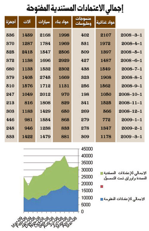 وبمقارنة قيم الاعتمادات المستندية المفتوحة لشهر مارس من العام 2009م مع شهر فبراير، يظهر أن قطاع التغذية انخفض بما يقارب ال12%، أما المنسوجات والملبوسات فقد ارتفعت بما يقارب 11% وكذلك مواد البناء التي جاءت بارتفاع تجاوز ال5%، أما قطاع السيارات فقد ارتفع بما يقارب 19% والآلات 50% وكانت الأجهزة صاحبة النصيب الأوفر، حيث ارتفعت بما يقارب ال115%.