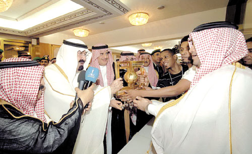 وتفضل- حفظه الله- بتسليم مكافأة المركز الثالث ومقدارها 1.5 مليون ريال والميداليات البرونزية لنادي الهلال ،ومكافأة المركز الرابع للمسابقة ومقدارها مليون ريال لنادي الحزم.