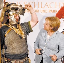 المستشارة الألمانية أنجيلا ميركيل تداعب أحد الممثلين وهو يرتدي ذي الجنود الرومان أثناء حفل افتتاح فيلمVarusschlacht لاذي يحكي حرباَ قامت قبل 2000 عام بين الجيوش الرومانية التي انهزمت أمام القبائل الألمانية. |