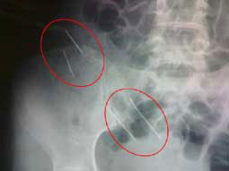وكانت الفتاة قد حضرت للمستشفي وهي تعاني من آلام شديدة بالبطن حيث تم فحصها سريرياً وبإجراء أشعة سينية لمنطقة الألم تم اكتشاف الإبر مما أثار استغراب الطبيب المعالج وبعد سؤال الفتاة عن مصدر هذه الإبر أكدت أنها لا تعلم عنها شيئاً.
