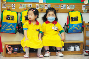 طفلة في إحدى رياض الأطفال ب(هونج كونج) ترتدي قناعاً واقياً بعد أن أصدرت السلطات أمراً بإغلاق المدارس بعد اكتشاف عدد من حالات انفلونزا الخنازير. |