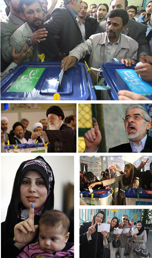 وجرت الحملة الانتخابية في أجواء من المنافسة الضارية غير المسبوقة في الجمهورية الإسلامية بين المرشحين وشهدت تجمعات ومهرجانات شعبية سيطرت عليها أجواء احتفالية. وأدلى أحمدي نجاد بصورة في ساعة باكرة في أحد أحياء جنوب شرق العاصمة وانتظر الرئيس الذي يحرص على تصوير نفسه في صورة (رجل الشعب) أربعين دقيقة في صف انتظار طويل قبل أن يضع بطاقته في صندوق الاقتراع، بحسب ما أفادت وكالة إيرنا الرسمية. وأعلن بعد ذلك أن (قرار الشعب الواضح والحازم والثوري سيمنحه مستقبلاً باهراً وتقدمياً). أما موسوي الذي أدلى بصوته أيضاً في طهران، فلمس (مؤشر خير) في الإقبال القوي لكنه دعا (المسؤولين إلى السهر على حراسة صناديق الاقتراع). وذكر معلومات تفيد أن بعض (ممثليه لم يسمح لهم بالقيام بمهام مراقبين) في مكاتب تصويت.
