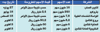 أعلنت هيئة السوق عن خطتها لطرح عدد 6 شركات جديدة للاكتتاب العام خلال الشهور الأربعة المقبلة يصل عدد الأسهم المطروحة للاكتتاب فيها إلى حوالي 282.7 مليون سهم، وبقيمة إجمالية تصل في حدها الأدنى إلى حوالي 2.8 مليار ريال، إلا إن هذه القيمة يتوقع أن تزيد قليلا عن هذا الرقم لأنه من المخطط طرح شركتين منها (أنابيب الصلب والمواساة الطبية) من خلال إتمام عملية بناء سجل الأوامر، أي أن هيئة السوق تعود من جديد للموافقة على هذا النظام الذي يخصص جزءا من الطرح للصناديق الاستثمارية والأشخاص المرخص لهم.. ومن المعروف أن هذا النظام يمكن الشركات المطروحة من الحصول على سعر أعلى من القيمة الاسمية للسهم، وهذا يأتي رغم حالة القلق من قيمة علاوة الإصدار في بعض الأطروحات السابقة، وعملية بناء سجل الأوامر، له تأثيرات متعددة أبرزها زيادة حدة التنافس على أسهم قد لا يحدث عليها هذا التنافس إذا طرحت بدون بناء سجل الأوامر، فضلا عن زيادة حدة المضاربة على هذه الأسهم عند إدراجها بالسوق. وكل ذلك يصب في طريق تداولها بسعر أعلى مما تستحق.