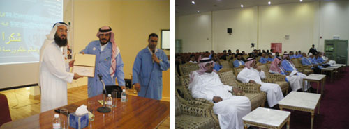 وفي ختام المحاضرة كرَّم عميد الكلية التقنية جمال المطلق كلاً من يوسف السحار ويزيد العوشن وشكر لهما الحضور والإفادة.