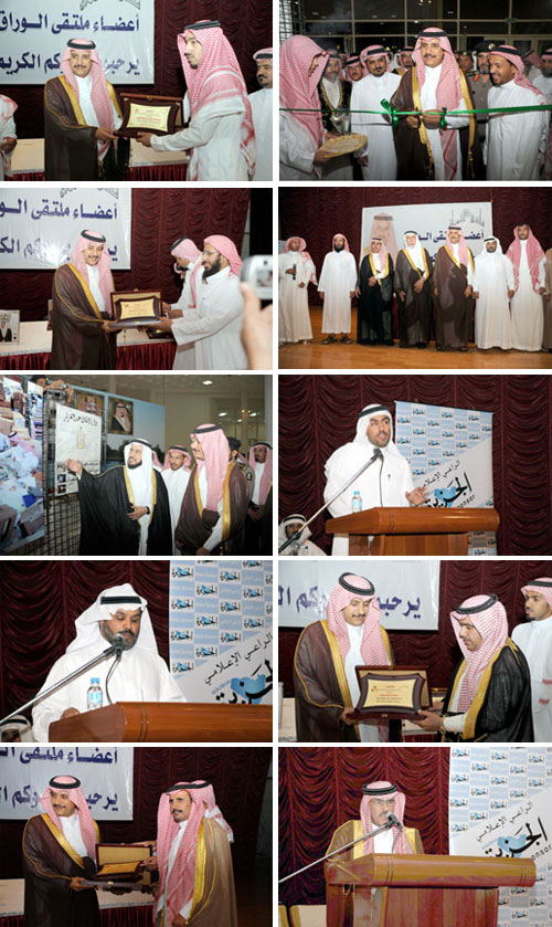 شرّف صاحب السمو الأمير عبدالرحمن بن عبدالله بن فرحان آل سعود محافظ المجمعة حفل ملتقى الوراق الخامس الذي أقيم بمدينة الأمير سلمان بن عبدالعزيز الرياضية بمدينة المجمعة بمحافظة المجمعة؛ حيث سبق النشاط الخطابي للملتقى قص شريط معرض الكتاب المصاحب للمعرض ثم تدشين كتاب الوراق