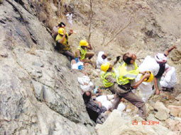 وباشرت فرقتا إنقاذ جبلي ميدانيتان الموقع وقامتا بتأمين نقل المصابين في نقالات مخصصة للكسور وباشر رجال إسعاف الهلال الأحمر تقديم الإسعافات الأولية للمصابين حتى وصول طائرة الدفاع المدني التي انتشلت المصابين من منطقة منحدرة ووعرة.. وآثر رجال الإنقاذ تدخل الإنقاذ الجوي تفادياً لمضاعفة إصاباتهما حيث تأثر أحدهما بكسر في الساق الأيمن وعدة إصابات متفرقة، فيما أصيب الآخر بعدة كدمات وجروح متفرقة، وقد شارك في الحادث الجهات المعنية من الدوريات الأمنية والمرور والهلال الأحمر والشئون الصحية.