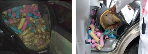 ضبطت دوريات المجاهدين سيارتين محملتين بكميات كبيرة من القات وذلك جنوب محافظة العارضة في قرية أبو سبيلة، وقد كانت السيارتان محملتين بنحو 2258 حزمة من القات المخدر، وطبقاً لما ذكره الناطق الإعلامي لإدارة المجاهدين، بمنطقة جازان خالد بن عبدالله قزيز بأن دورية من الفرقة الثانية بالعارضة تمكنت من ضبط سيارتين كانت تقوم بتهريب القات، وذلك بالموقع المسمى أبو سبيلة جنوب محافظة العارضة، والسيارتين من نوع لومينا وايسوزو، مشيراً إلى أن السيارة الأولى من نوع لومينا وكانت تقوم بتهريب 2258 حزمة قات بلغت وزنها أكثر من طن ونصف الطن، وأضاف أن السيارة الثانية من نوع يسوزو، وقد قام بتخبئة القات أسفل المراتب الخلفية وبداخل المقاعد الأمامية للتمويه على رجال الأمن.