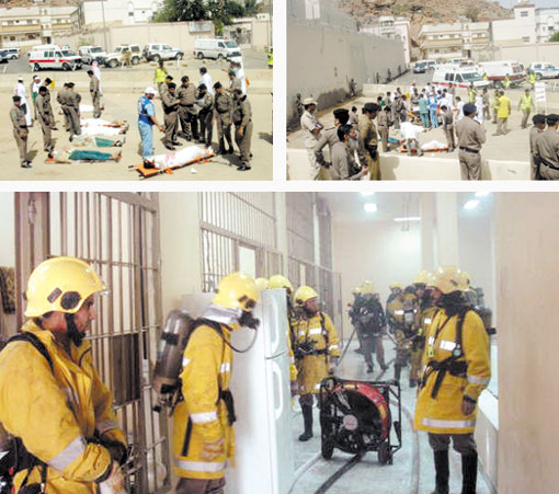 نفذت إدارة الدفاع المدني بمحافظة الطائف لمباشرة أعمال الإخلاء والإيواء والإطفاء والإنقاذ والإسعاف بالسجن العام بالمحافظة، لثلاثة عشر إصابة ووفيتان خلفها حريق وهمي بالعنبر رقم (2) بالسجن العام خلال خطة الطوارئ في حين تم إخلاء عدد (120) سجينا من العنبر إلى مناطق آمنة خارج السجن في حين تم إخلاء العنابر الأخرى البعيدة عن موقع الحدث في الجهة الجنوبية من ملحقات السجن الآمنة.