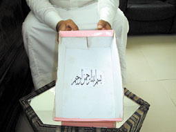 عثر المواطن سعد المطيري على لفظ الجلالة في كرتون أحذية اشتراه من محل بحفر الباطن قبل حوالي ثلاثة أشهر.