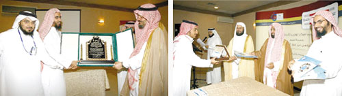 وأشار إلى أن إقامة هذا البرنامج والذي يعد الأول من نوعه تمت بناء على الحاجة التي لمسناها في الميدان والذي نتوقع ان يكون منهم في المستقبل الطبيب والمهندس والطيار والعالم، موضحا انه تم اختيار نخبة متميزة من العاملين في مجال رعاية الموهوبين منذ سنوات لتولي تنفيذ هذا البرنامج. ثم ألقى الدكتور توفيق خوجة كلمة أولياء أمور الطلاب أشاد فيها بمركز نورين وبرامجه المميزة ومنها هذا البرنامج الذي وجدنا اثره الايجابي على سلوك وتعامل ونشاط ابننا في المنزل. ثم ألقى الأستاذ نبيل البدير كلمة نوه فيها بالأسلوب العلمي الجديد للجمعية الخيرية لتحفيظ القرآن الكريم في منطقة الرياض للعناية بالموهوبين في حلقات التحفيظ. وقال ان هذا البرنامج يعد الأول من نوعه على مستوى العالم الإسلامي كما اعلم. ثم ألقى الشيخ عبدالرحمن الهذلول كلمة نوه فيها بالدعم الذي توليه الدولة بقيادة خادم الحرمين الشريفين وسمو ولي عهده الأمين وسمو النائب الثاني للقرآن الكريم ولحفظة القرآن الكريم وللموهوبين في مختلف المجالات. وأعرب عن شكره لأولياء أمور الطلاب على حرصهم واهتمامهم بابنائهم الطلاب والعمل على استثمار اوقاتهم في كل ما يعود عليهم بالنفع والفائدة. ثم ألقى أحد الطلاب نصا لاحد المتون العلمية الشرعية التي حفظها. ثم قام الشيخ عبدالرحمن الهذلول بتوزيع الدروع والهدايا على الجهات الداعمة والأستاذ صالح الزهراني للطلاب المشاركين ثم قام الدكتور توفيق خوجة بتقديم درع لمركز نورين تسلمه الدكتور يوسف المهوس ودرع للمشرف على البرنامج الأستاذ مبارك آل سيف وللمشرفين على البرنامج الأستاذ عبدالعزيز الصالح والأستاذ خالد القحطاني.
