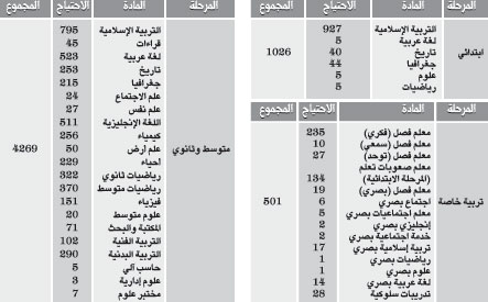 أعلنت وزارة الخدمة المدنية بالتعاون مع وزارة التربية والتعليم (تعليم البنين) عن الوظائف التعليمية للرجال التي طلبت وزارة التربية والتعليم - تعليم البنين إشغالها وعددها (5796) وظيفة تعليمية شاغرة في مجالات التعليم العام والتربية الخاصة ومحضري المختبرات المدرسية في التخصصات الموضحة حسب الجداول المرفقة وسيتم شغل هذه الوظائف وما يرد مستقبلاً من وزارة التربية والتعليم (تعليم البنين) من وظائف مماثلة، وذلك حسب معايير المفاضلة (المحددة عناصرها على موقع الوزارة على شبكة الإنترنت) بين الخريجين اللذين سبق أن تقدموا على موقع الوزارة على الإنترنت خلال الفترة من 18 - 7 - 1430هـ وحتى 29 - 7 - 1430هـ من حاملي المؤهلات المناسبة للتعليم التي تضمنها الإعلان الصادر بتاريخ 15 - 7 - 1430هـ بالإضافة إلى المتقدمين على موقع الوزارة العام الماضي للوظائف التعليمية للرجال ولم يقوموا بتعديل بياناتهم.