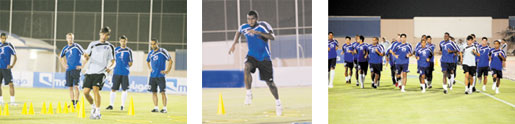 وعلى صعيد التدريبات أجرى الفريق الأزرق تدريبه البارحة استعدادا لمقابلة نجران الاربعاء المقبل وتنوعت التدريبات ما بين لياقية في جزئها الأول فيما ارتكزت على النواحي التكتيكية في باقي فترات المران وحاول جريتيس تطبيق بعض الجمل الكروية وشرح بعض الأخطاء التي وقعت في مباراة القادسية من خلال إقامة مناورة على كامل الملعب وشهدت حماسا كبيرا من اللاعبين وتفاعلا ملحوظا من الجماهير الكبيرة التي حرصت على متابعة تحضيرات فريقها فيما أخفى المدرب معالم التشكيل الأساسي بعد أن حول أكثر من لاعب إلى الفريق الرديف وإعادتهم مرة أخرى وبرز الكوري لي يونج كثيرا بإحرازه لهدف خرافي من مسافة بعيدة أجبر جميع الحضور على التصفيق بحرارة، وفي المقابل جاء انضمام خالد عزيز إلى التدريبات الجماعية ودخوله في المناورة أبرز ما دار في ردهات النادي العاصمي أمس وذلك في إشارة إلى اقتراب انفراج الأزمة التي طرأت مؤخرا ومن المحتمل أن يكون أحد خيارات المدرب في اللقاء المقبل بعد أن تعافى اللاعب من الإنفلونزا التي ألمت به أمس الأول وغاب على إثرها عن التدريب.