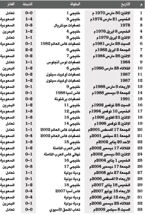 وفيما يلي جدول يوضح سجل لقاءات منتخبنا السعودي مع البحرين.