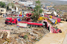 وقال شهود عيان إن موجات من المياه الموحلة تحمل سيارات وأشجارا وحطاما اصطدمت بمنازل ومبان صباح الأربعاء حيث قام السكان لتناول السحور.