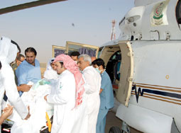 تعرضت عائلة من الجنسية البحرينية الخميس الماضي لحادث مروري على طريق الرياض القصيم السريع بالقرب من مخرج مدينة تمير إثر انقلاب سيارتهم الذي نتج عنه عدد من الإصابات المتوسطة والبليغة وحالة وفاة لطفلة تبلغ من العمر 14 عاماً، حيث تم إسعافهم ونقلهم لمستشفى تمير العام لإكمال علاجهم حيث مكثوا بالمستشفى يومين بعد ذلك جاءت الموافقة لنقلهم إلى مطار الملك خالد الدولي بالرياض عبر طائرتي إخلاء تمهيداً لنقلهم لمستشفى السليمانية بمملكة البحرين، حيث وصلت طائرتا الإخلاء إلى مستشفى تمير أمس الأول حيث تمت تهيئة وإخلاء الموقع من قبل شرطة تمير ومتابعة ومراقبة الموقع من قبل الدفاع المدني بتمير بتواجد سيارة إطفاء.