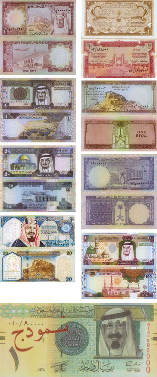 ثم توالى إصدار العملات الورقية في عهود حكام الدولة السعودية فبموجب المرسوم الملكي رقم (6) الصادر في غرة رجب سنة 1379هـ الخاص بإصدار النقود الورقية النظامية، تم طرح أول إصدار نقدي ورقي رسمي، في عهد جلالة الملك سعود بن عبد العزيز بخمس فئات، هي: فئة المائة ريال، والخمسين ريالاً، والعشرة ريالات، والخمسة ريالات، والريال الواحد، بتاريخ 1-1-1381هـ الموافق 14-6-1961م، وتم سحبه من التداول بتاريخ 1- 5-1391هـ الموافق 24-6- 1971م ثم طرح الإصدار الثاني في عهد جلالة الملك فيصل بن عبد العزيز بفئاته الخمس: (المائة ريال، والخمسين ريالاً، والعشرة ريالات، والخمسة ريالات، والريال الواحد، بتاريخ 15- 11-1387هـ وظل حتى سحب من التداول بتاريخ 1- 7-1400هـ بعد ذلك طرح الإصدار الثالث من النقود الورقية، في عهد جلالة الملك خالد بن عبد العزيز بفئاته الخمس: المائة ريال، والخمسين ريالاً، والعشرة ريالات، والخمسة ريالات، والريال الواحد، بتاريخ 16-10- 1396هـ. وفي عهد خادم الحرمين الشريفين الملك فهد بن عبد العزيز طرح الإصدار الرابع من النقود الورقية في غرة ربيع الثاني سنة 1404هـ الموافق (4-1- 1984م) وانفرد هذا الإصدار بإضافة فئة الخمسمائة ريال، لأول مرة إلى فئات النقد السعودي، استجابة للتوسع في التعاملات النقدية، بسبب التطور الاقتصادي الذي تعيشه البلاد، بالإضافة إلى فئات المائة ريال، والخمسين ريالاً، والعشرة ريالات، والخمس ريالات، والريال الواحد.