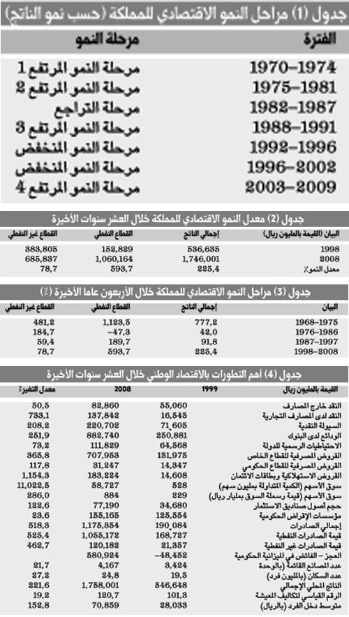 يعد الاقتصاد الوطني من الاقتصاديات التي مرت بمراحل نمو قوية مرتبطة بأحداث أو مستجدات اقتصادية وسياسية عالمية. وقد جاءت أولى هذه الطفرات مرتبطة بالثورة النفطية الأولى في عام 1973م، ثم ارتبط بالثورة النفطية الثانية في عام 1979م. وإذا أردنا تصنيف مراحل النمو الاقتصادي للمملكة خلال الأربعين عاما الأخيرة، فإن أعلى مرحلة نمو هي التي حدثت خلال الفترة 68-1975م، والتي نمى فيها الاقتصاد الوطني بما يعادل 777.2% جملة واحدة، أي بمعدل نمو سنوي يعادل 111% سنويا، وهي تمثل مرحلة النمو القوي في الأسعار العالمية للنفط. تلاها مرحلة هدوء نسبي (76-1986م)، حيث تراجعت أسعار النفط، إلا أن الاقتصاد الوطني استطاع خلال تأسيس قطاع غير نفطي قادر على خلق رافد بديل للنمو، حيث نما القطاع غير النفطي خلال هذه الفترة بما يعادل 184.7% ليعوض التراجع في القطاع النفطي. ثم بدأت مرحلة النمو المنخفض خلال الفترة (87-1997م)، حيث بدأت أسعار النفط تتحرك من جديد. إلا أن هذا النمو المنخفض تحول إلى نمو مرتفع خلال الفترة (98-2008م) لينمو الناتج المحلي الإجمالي بنسبة 225.4% في ظل الطفرة النفطية الثالثة.