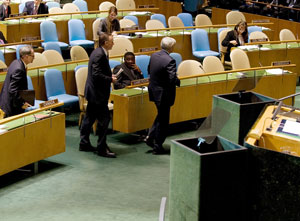 تبنى مجلس الأمن الدولي أمس الخميس بإجماع أعضائه خلال جلسة استثنائية برئاسة الرئيس الأمريكي باراك اوباما قراراً يدعو فيه إلى إرساء عالم خال من الأسلحة النووية. وخاطب اوباما سائر أعضاء المجلس ألـ 14 قائلاً (من غير الممكن كسب حرب نووية ويجب بالتالي ألا تقع). ويدعو القرار 1887 الذي أعدته الولايات المتحدة الدول التي وقعت معاهدة منع انتشار الأسلحة النووية (تي ان بي) للوفاء بالتزاماتها والدول الأخرى للانضمام إليها في أسرع وقت بصفتها دولاً لا تملك سلاحاً نووياً بهدف تعميم ذلك في كل أنحاء العالم. ووقعت المعاهدة 189 دولة باستثناء إسرائيل وباكستان والهند.. أما كوريا الشمالية فقد تخلت عن المعاهدة في 2003. كما تبنى قادة الدول الكبرى وعلى رأسهم الرئيسان الأمريكي باراك اوباما والفرنسي نيكولا ساركوزي موقفاً حازماً حيال البرنامج النووي الإيراني وحذر اوباما في خطابه أمام أكثر من 120 رئيس دولة وحكومة من ان إيران وكوريا الشمالية تهددان بجر العالم إلى منزلق خطير. وتزامن موقف الدول الكبار في مجلس الأمن مع خطاب مثير للجدل للرئيس الإيراني محمود احمدي نجاد في الجمعية العامة للأمم المتحدة بنيويورك. وقد غادرت وفود 12 بلداً يتصدرها الوفد الفرنسي وبينها الوفد الأمريكي أمس القاعة الكبرى للجمعية العامة احتجاجا على خطاب نجاد الذي اعتبر معادياً للسامية. وغادرت وفود الأرجنتين واستراليا وبريطانيا وكوستا ريكا والدنمارك وفرنسا وألمانيا والمجر وإيطاليا ونيوزيلندا وأمريكا القاعة حين بدأ نجاد انتقاد إسرائيل.