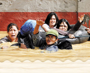عائلة فلبينية متشبثة ببالونة إنقاذ خلال نزوحهم من منازلهم جراء الفيضانات في الوقت الذي ذكر مسؤولون أمس أن حوالي 100 شخص قتلوا بعد أن اجتاحت العاصفة الاستوائية (كيتسانا) مناطق شاسعة في أنحاء الفلبين، وتسببت في هطول أمطار غير مسبوقة على العاصمة مانيلا، نجم عنها أسوأ موجة من الفيضانات تشهدها البلاد منذ