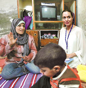 نجمة السينما الأمريكية أنجيلينا جولي سفيرة النوايا الحسنة كمندوب للأمم المتحدة للاجئين، خلال زيارتها لإحدى الأسر العراقية اللاجئة الفقيرة في إحدى الضواحي جنوب العاصمة السورية دمشق...>>>...