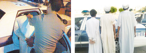 جاء ذلك عندما ضبطت فرق دوريات الأمن بمنطقة الرياض ثلاثة أشخاص بعد دخولهم على عمالة وافدة وانتحالهم لشخصيات رجال الأمن وعند مشاهدتهم للفرق هربوا على سيارتهم حيث تم مطاردتهم من قِبل الفرق حيث قاموا بعمل عدة حوادث صدم وتم ضبطهم وجد بحوزتهم عدد 8 جوالات وأصبع من الحشيش المخدر وقارورة من العرق المسكر تم تسليم الجناة لمركز شرطة العليا.