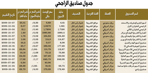 أما صندوق الراجحي للأسهم الأوروبية فقد انخفضت قيمة وحدته بما يقارب 1.84 بالمئة لتنخفض من مستوى 112.87 دولار إلى 110.97، كما انخفض صندوق الراجحي للأسهم العالمية بما يقارب 1.88 بالمائة حيث انخفضت قيمة وحدته من 139.92 لتستقر عند 137.29 دولاراً حسب تقييم 4-10- 2009، كما انخفضت قيمة وحدة صندوق أسهم الشركات العالمية الصاعدة من 93.74 دولاراً إلى 91.91 دولاراً بتقييم 4-10-2009 لتسجل انخفاضا يقارب ال1.95%.