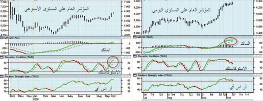 لو نظرنا إلى الرسم البياني المرفق والذي فيه المؤشر العام على المستوى اليومي وبعض المؤشرات الهامة لوجدنا فيه أن الماكد على المستوى اليومي في مناطق متضخمة رغم أنه لم يتقاطع سلبا حتى إغلاق الأربعاء إلا أنه يقف عند قيمة 155 وهذه تعبر من القيم التي تشير إلى التضخم على المستوى اليومي وكذا الاستوكاستك والذي بدأ في التقاطع السلبي على المستوى اليومي أما مؤشر (آر اس آي) فتوقف عند مستوى 72 يوم الأربعاء وهو في منطقة تشير إلى التضخم النسبي وغالبا يبدأ التضخم في هذا المؤشر بعد تجاوز قيمة 70 وربما تشير هذه القراءة إلى حاجة المؤشر على المستوى اليومي إلى جني أرباحه وتراجعه لتكوين نقاط دعم قوية يرتكزعليها في مواصلة الارتفاع.