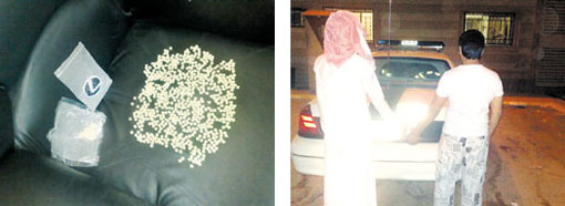 جاء ذلك عندما نصبت فرق دوريات الأمن بمنطقة الرياض نقطة تفتيش متحركة بحي النظيم وعندما شاهد الجانيان رجال الأمن أمامهما حاولا الهروب باتجاه معاكس تم مطاردتهما والاطاحة بهما بالقوة حيث عثر بحوزتهما على كمية حبوب كبتاجون المخدر عدد 765 حبة كما تبين أن السيارة التي يستقلانها نوع كامري مسروقة. سلم الجانيان وما ضبط بحوزتهما لإدارة مكافحة المخدرات شرق الرياض لاستكمال التحقيق معهما.
