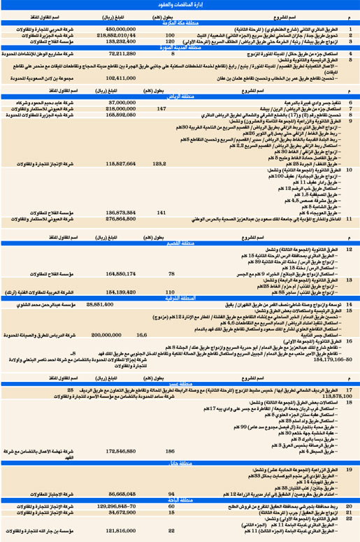 وأشاد معاليه بالدعم الكبير لمشاريع الطرق من لدن خادم الحرمين الشريفين وصاحب السمو الملكي ولي العهد الأمين وصاحب السمو الملكي النائب الثاني. والجدول التالي يبين تفاصيل المشروعات.