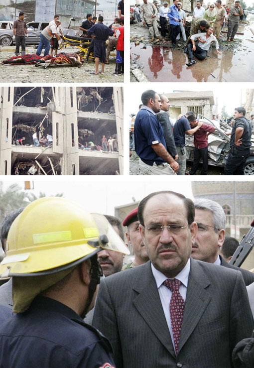 انفجرت سيارتان ملغومتان استهدفتا مبنيين حكوميين مما أسفر عن مقتل 132 شخصاً على الأقل وإصابة أكثر من 600 في وسط بغداد أمس الأحد في أدمى الهجمات في العاصمة العراقية منذ شهور. وهز الانفجاران القويان مباني وتصاعد دخان من المنطقة في وسط بغداد قرب نهر دجلة. وذكرت الشرطة والتلفزيون العراقي أن الانفجارين استهدفا مبنى الحكم المحلي ببغداد ووزارة العدل.