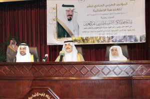 تحت رعاية صاحب السمو الملكي الأمير سلطان بن عبدالعزيز آل سعود ولي العهد نائب رئيس مجلس الوزراء وزير الدفاع والطيران والمفتش العام افتتح صاحب السمو الملكي الأمير محمد بن فهد بن عبدالعزيز أمير المنطقة الشرقية فعاليات المؤتمر العربي الحادي عشر للهندسة الإنشائية الذي تستضيفه جامعة الملك فهد للبترول والمعادن خلال الفترة من 6 إلى 8 ذي القعدة 1430هـ بمشاركة محلية ودولية واسعة، وبعد أن أخذ سموه مكانه في منصة الحفل استهل بعدد من الكلمات في هذه المناسبة ثم عقب ذلك قال سمو أمير المنطقة: يسرني أن افتتح المؤتمر نيابة عن سيدي صاحب السمو الملكي الأمير سلطان بن عبدالعزيز -حفظه الله-.. الذي شرفني أن أنقل لكم تحياته وأمنياته -رعاه الله- لكم جميعاً وأن يحقق أهدافه المرجوة في تبادل المعلومات والخبرات والاطلاع على آخر المستجدات في الهندسة الإنشائية أقدم العلوم الهندسية وأكثرها تعبيراً عن التطوير الإنساني.