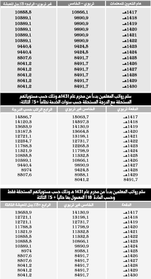 وبينت اللجنة أن المعلمين من دفعة 1417 هـ ستكون مرتباتهم على 3 درجات وذلك لأن تلك الدفعة قد تم تعيينهم على 3 درجات مختلفة فمنهم من سيكون بحلول محرم المقبل على الدرجة 11 ومنهم من سيكون على الدرجة 12 وآخرين على الدرجة 13، وهذا الأمر وقع مع المعلمات من نفس الدفعة أيضاً.