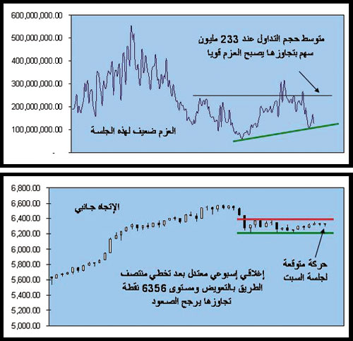 محاولة خجولة من المؤشر العام مع الافتتاح لتجاوز مستوى 6356 نقطة حيث وصل إلى 6346 نقطة وعاد ليختبر مناطق قريبة من 6308 نقاط لكن مع هذا الانخفاض لوحظ تراجع في حجم تداول الجلسة إلى 125 مليون سهم وهذا جيد مع الهبوط دليل استمرار العزوف عن البيع وبإغلاق السوق عند 3318 نقطة أنهى أسبوعاً يظهر فيه سيطرة المشترين وتعويض معظم خسائر الأسبوع الماضي.. لكن نذكر بأن الاتجاه ما زال جانبياً وعزومه متوسطة بالمجمل، أما من حيث أهم المعطيات التي ظهرت خلال تداولات هذه الجلسة هو عودة أسعار خامات النفط لملامسة حاجز الثمانين دولاراً للبرميل مرة أخرى لكن عادت لتنخفض بشكل طفيف عن الحاجز النفسي خصوصاً مع توقعات بارتفاع مخزونات النفط الأمريكية لهذا الأسبوع إلى 1.8 مليون برميل ولوحظ من إعلانات شركات هذه الجلسة أن معظمها تخص بعض الشركات حول تغيير في عضوية مجالس إداراتها ولا سيما أن فترة حظر تعاملاتهم ما زالت قائمة.