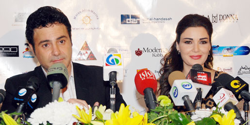 المغني اللبناني عاصي الحلاني ومواطنته المغنية سيرين عبدالنور أثناء مؤتمر صحفي عقد في القاهرة بمناسبة عمل خيري لصالح مستشفى أبو الريش للأطفال.