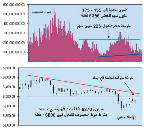 جلسة الأربعاء يبدو أن صانع السوق يمنح المصارف آخر فرصة للترتيب والتأسيس جيداً دون 15000 نقطة ويتوقع أن يكون ديسمبر الشهر الأخير لتواجد البائعين في القطاع، وبعد أن صحح السوق هذه الأخطاء ومع عودة الدولار للانخفاض وخفة وطأة ديون دبي وارتفاع أحجام تداول المصارف إلى 38 مليون سهم بأكثر من متوسط 30 يوماً لجلسة ما قبل الأمس يمكن القول بأن ما تم كسره من دعوم كان عارضا ويبقى المهم هو تداول أسهم المصارف فوق 16310 نقطة، أما سابك فسيكون المحرك الأساسي لها هو أسعار النفط خلال ما تبقى من أيام الأسبوع والتي تظهر عودة أسعار الخامات فوق مستوى 73 دولاراً للبرميل لوحظ ذلك في الأمس، وفيما يتعلق بأهم ما أعلن عنه هو موافقة هيئة السوق المالية لإصدار صكوك للبنك السعودي الهولندي لكن يبقى السؤال هل هذا التمويل لتغطية انكشافات مالية أو لتوسعات تشغيلية يطمح لها البنك؟ وما زالت المعلومات شحيحة بشأنه حتى الآن، أيضاً حصول مجموعة المعجل على رخصة جديدة في الإمارات العربية المتحدة، وبصهر جميع المعطيات الحالية ودمج حركة التداول لآخر 32 جلسة يرجح أن يغلق السوق عند 6105 نقطة بعد زيارة لمستوى 6155 نقطة وبأحجام تداول يمكن أن تبلغ 155 مليون سهم.