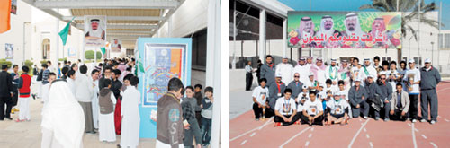 تواصلت مظاهر الفرح في مدارس الرياض ابتهاجاً بعودة سلطان الخير ولي العهد الأمين نائب رئيس مجلس الوزراء وزير الدفاع والطيران والمفتش العام صاحب السمو الملكي الأمير سلطان بن عبدالعزيز -حفظه الله- والأمير سلمان بن عبدالعزيز أمير منطقة الرياض والرئيس الفخري للمدارس.. حيث عبر طلاب مدارس الرياض عن أفراحهم بهذه المناسبة الغالية بعشرات الفعاليات.. فبينما احتفلت المرحلة الابتدائية (بمهرجان فني) شارك فيه عشرات الطلاب بإشراف من مشرف ومعلمي التربية الفنية تم فيه رسم وعمل اللوحات لسمو ولي العهد الأمير سلطان بن عبدالعزيز تزينت المدارس باللوحات الترحيبية والأعلام المزدانة بصور خادم الحرمين الشريفين وولي عهده الأمين والأمير المحبوب سلمان بن عبد العزيز فيما اختارت المرحلة الثانوية عمل (كعكة ضخمة من الحلوى) تعبيراً عن هذه المناسبة شاركهم في الاحتفال الدكتور عبد الإله بن عبد الله المشرف مدير عام المدارس ومدير مدارس البنين وعدد من قيادات ومنسوبي المدارس.. وإنفاذاً لتعميم وزير التربية والتعليم، وذلك بشأن تفعيل الحصة الأولى والثانية من يوم الاثنين الماضي للاحتفاء بعودة ولي العهد الأمير سلطان بن عبدالعزيز آل سعود إلى أرض الوطن متمتعاً بالصحة والعافية.وأقام نادي الأمير فيصل بن فهد بمدارس الرياض صباح الاثنين مهرجاناً رياضياً لكافة منسوبي المدارس بقسم البنين حيث شمل المهرجان ماراثوناً للجري حول المضمار بالملعب الرئيس شاركت فيه جميع المراحل.. ثم تلا ذلك سباق الدراجات الهوائية.. ومن ثم عدد من الألعاب الرياضية والتنافسية.. كل ذلك ابتهاجاً وتعبيراً عن الفرح والسرور لعودة صاحب السمو الملكي الأمير سلطان حيث ازدان الملعب ومدرجاته بالأعلام والبالونات وصور خادم الحرمين وولي عهده الأمين الأمير سلطان وسمو النائب الثاني الأمير نايف بن عبد العزيز وسمو الأمير سلمان بن عبد العزيز، وقد تخلل المهرجان أيضاً عدد من القصائد ألقاها عدد من الطلاب والمعلمين نالت استحسان الجميع، وفي ختام المهرجان قام الأستاذ عبد المحسن الحزيمي مدير مدارس البنين بتوزيع الجوائز على الطلاب والفرق الحائزة على المراكز الأولى.. وانتهى المهرجان برفع التهاني والتبريكات لمقام خادم الحرمين الشريفين وأصحاب السمو الأمراء والمسئولين والشعب السعودي بعودة سلطان الخير إلى المملكة.. متمنين له دوام الصحة والعافية.
